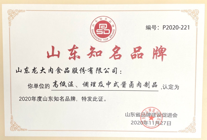 11月27日,2020年山(shān)東品牌年會在濟南召開。活動現場發布了2020年度山(shān)東知名(míng)品牌認定名(míng)單,龍大肉食“高低溫、調理(lǐ)及中(zhōng)式醬鹵肉制品”“冷鮮肉和冷凍肉”兩大産(chǎn)品系列成功入選。